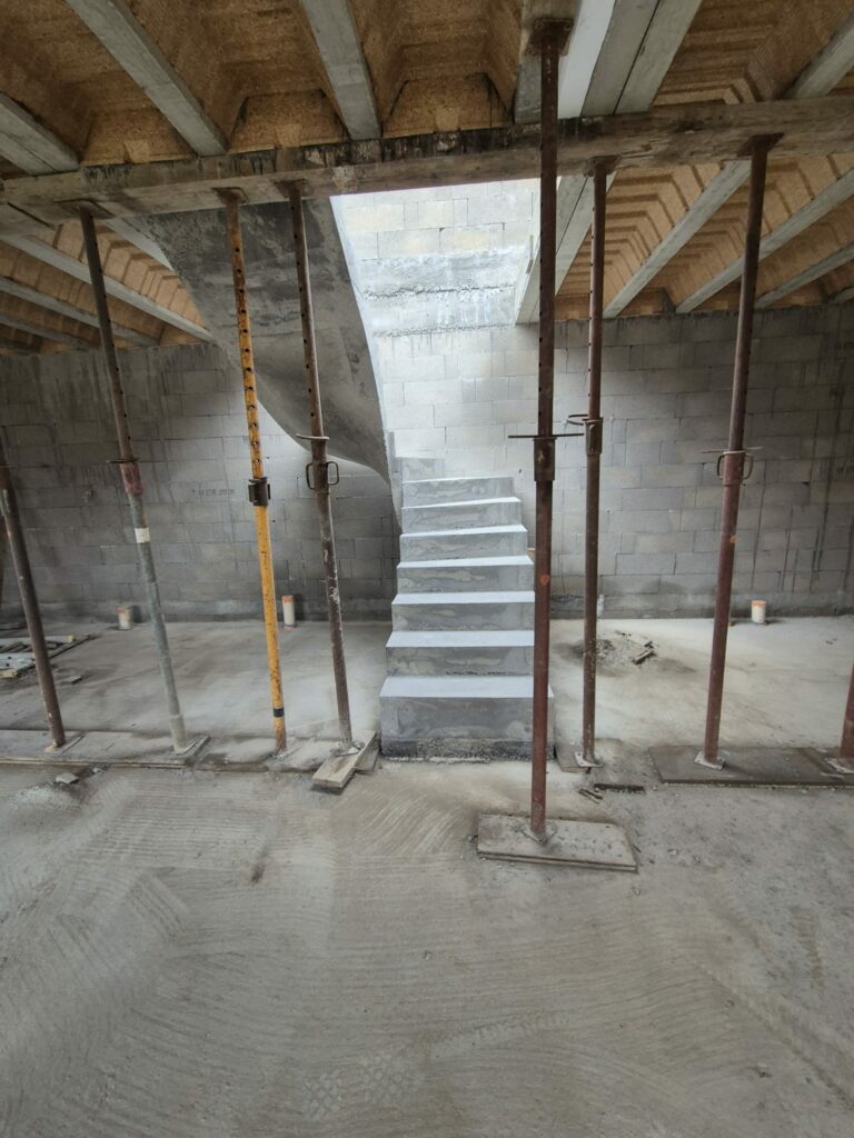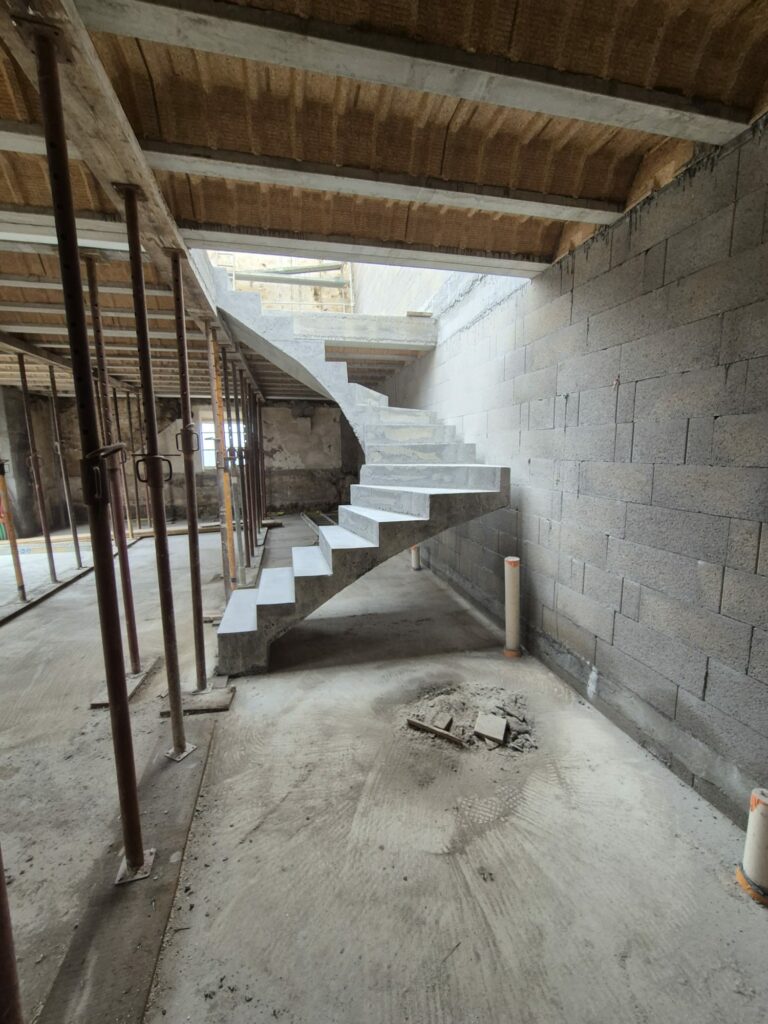 Cet escalier béton 2/4 tournant a été conçu comme une base structurelle précise, destinée à accueillir une finition ultérieure. Dès le chantier, les proportions, le tracé des marches et la régularité des volumes sont travaillés avec exigence afin d’assurer un rendu final fluide et élégant.