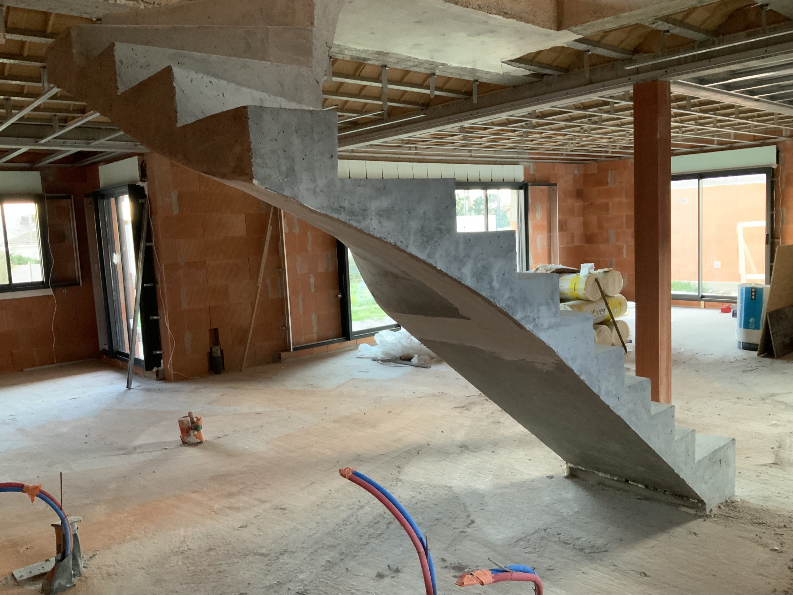 escalier à paillasse deux quart balancé en béton brut de décoffrage . Réalisation à Bruges entre Bordeaux et blanquefort en Gironde pour un constructeur Scal’in Aquitaine