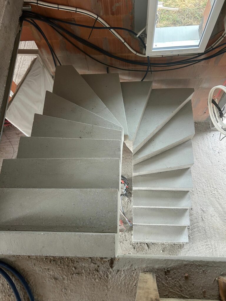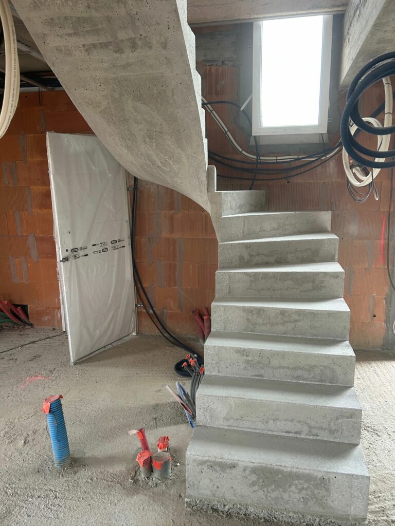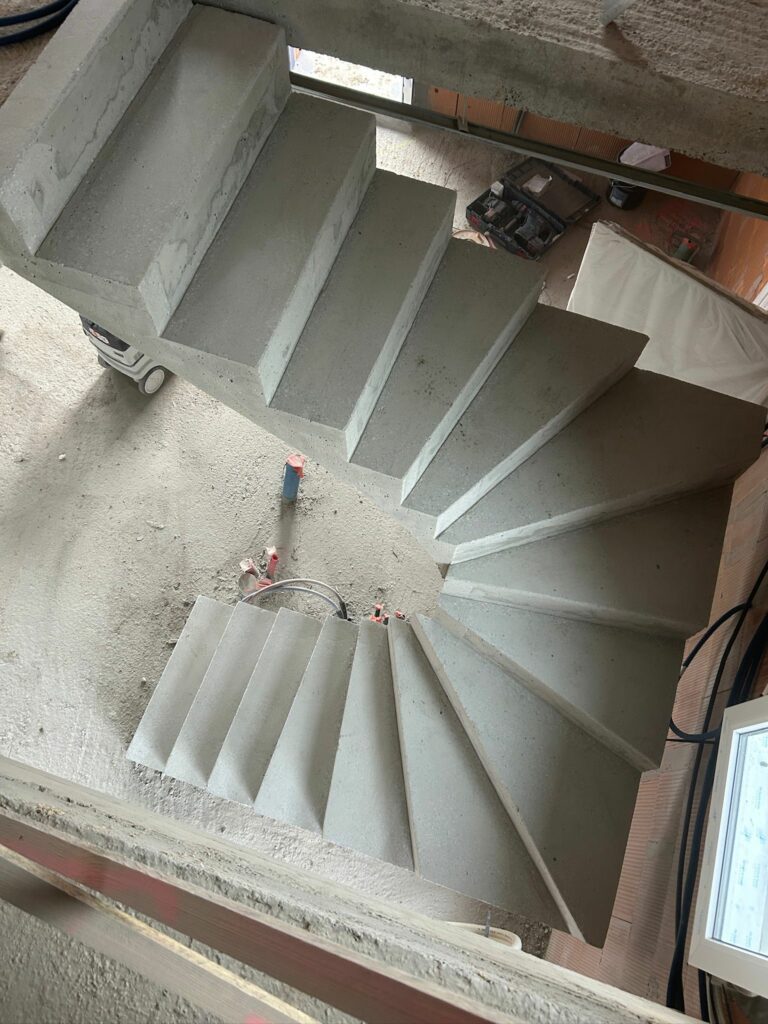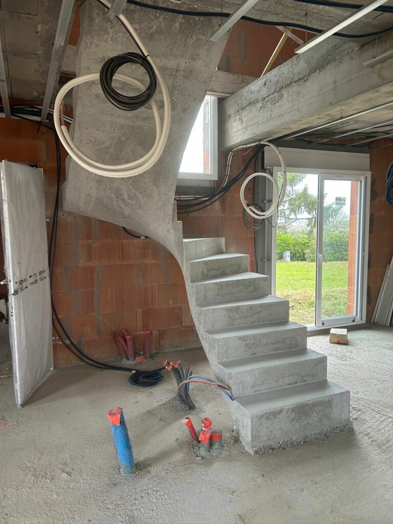 À Hossegor, cet escalier béton à paillasse 2/4 tournant affirme une vraie présence architecturale.