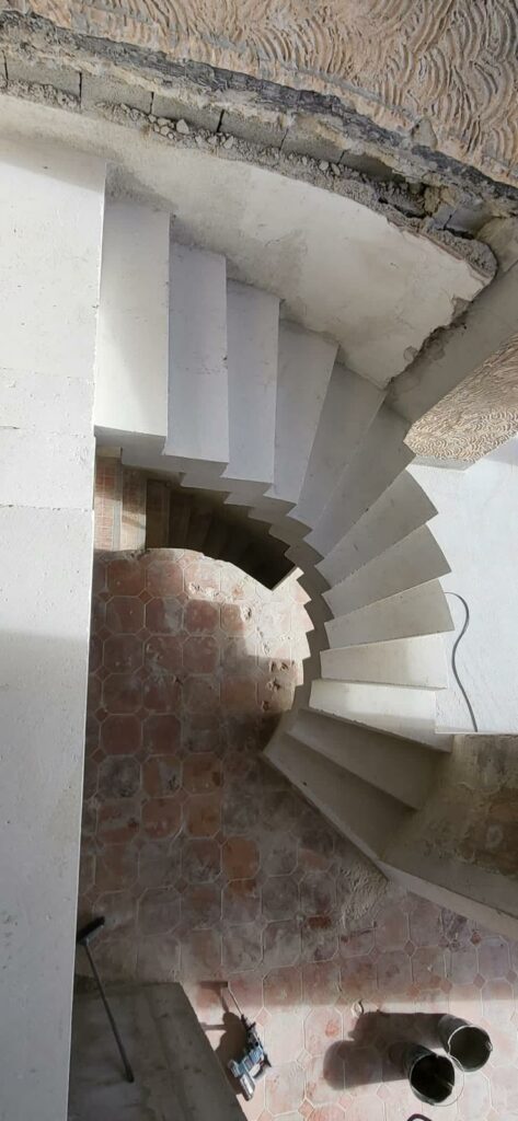 Réalisation d’un escalier à crémaillère courbe en béton brut de décoffrage pour un particulier à Carry-le-Rouet.