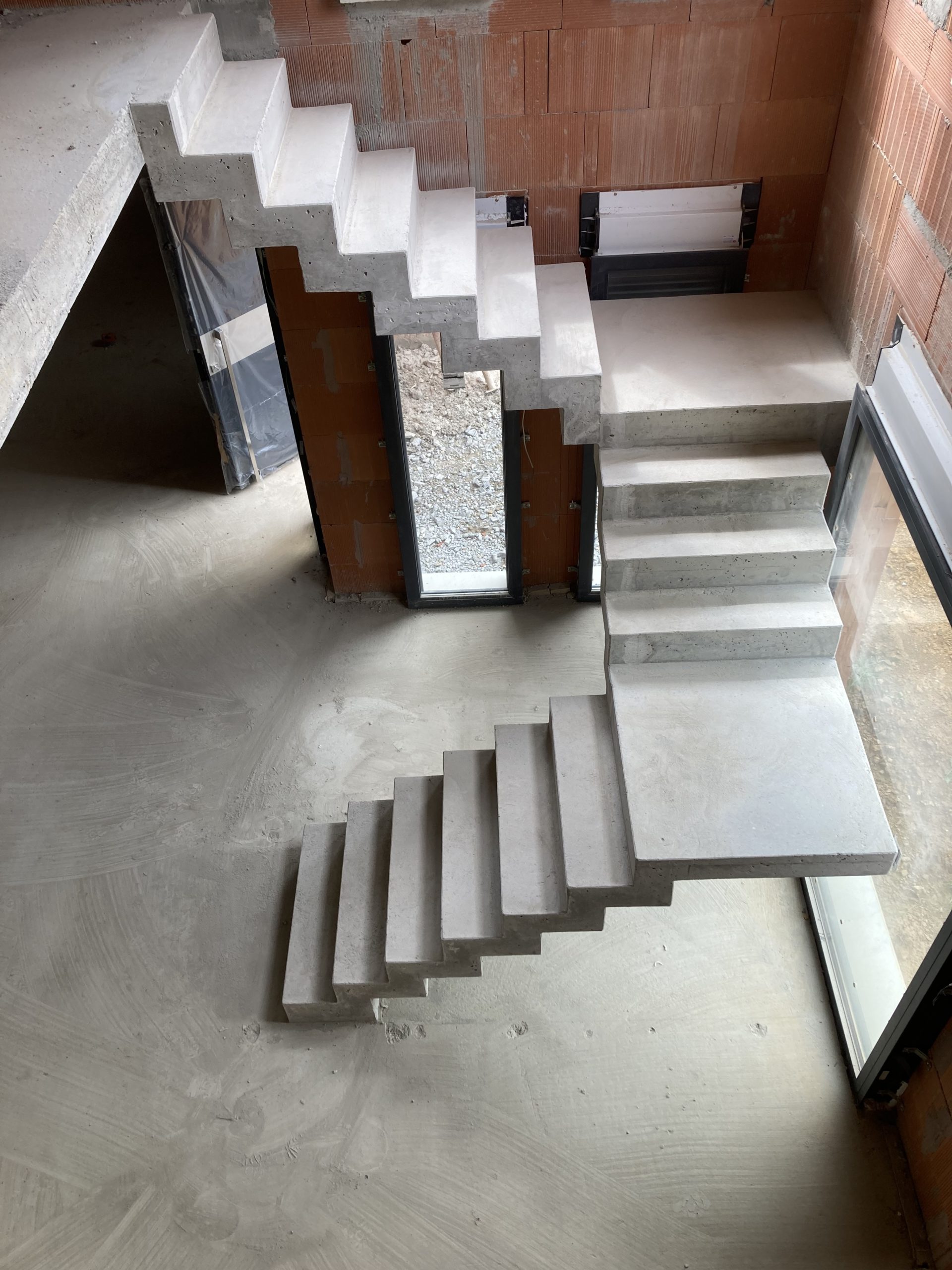 escalier béton à crémaillère devant une baie vitrée à châssis fixe.